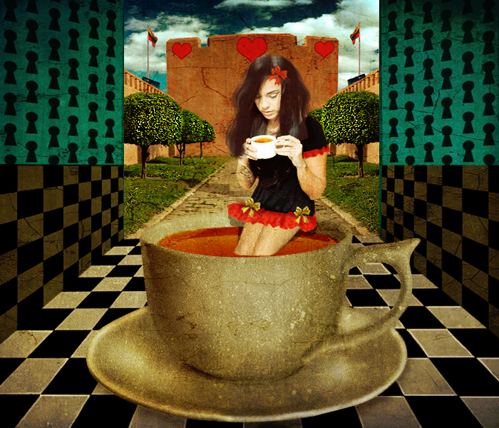 In the center, the girl sits in a cup of tea and she is drinking tea from another cup. All in all we have a strange looking photo manipulation just the style for Alice in Wonderland.