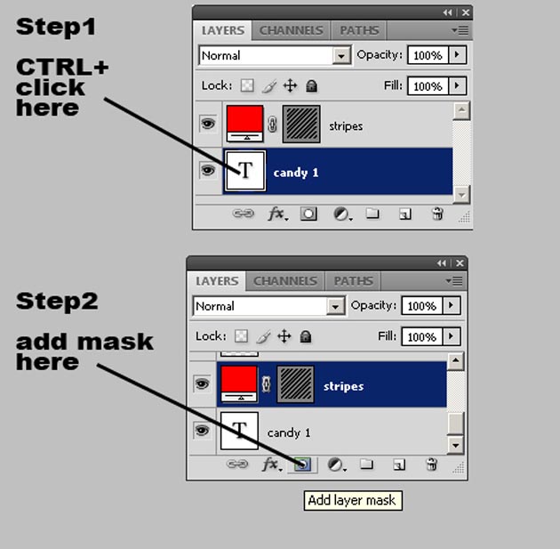 If I have both Candy 1 and Stripes layers selected, the "Add Layer Mask" button is disabled. How do you get the dotted selection lines around the letters as shown or remove the stripes around the letters? reply