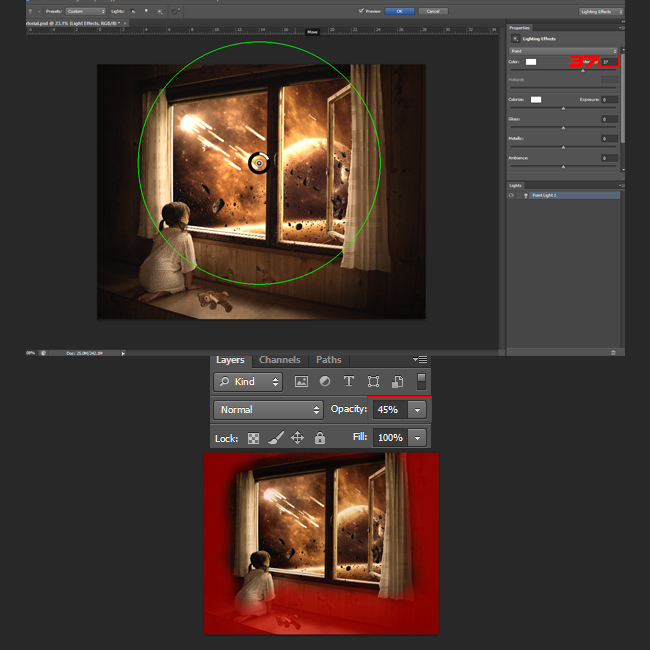 Press CTRL+SHIFT+ALT+E to merge all layers. Go to Filter > Render > Lighting Effects and set Intensity to 37% . Now create a layer mask and use brush tool to delete all around the window. Opacity is 45%.