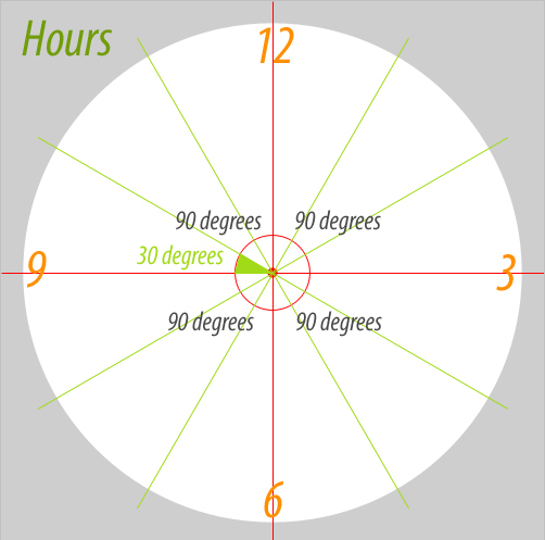 If we divide the circle in 12 areas we obtain all 12 hours, separated by an angle of 30 degrees (360 degrees / 12 = 30 degrees).