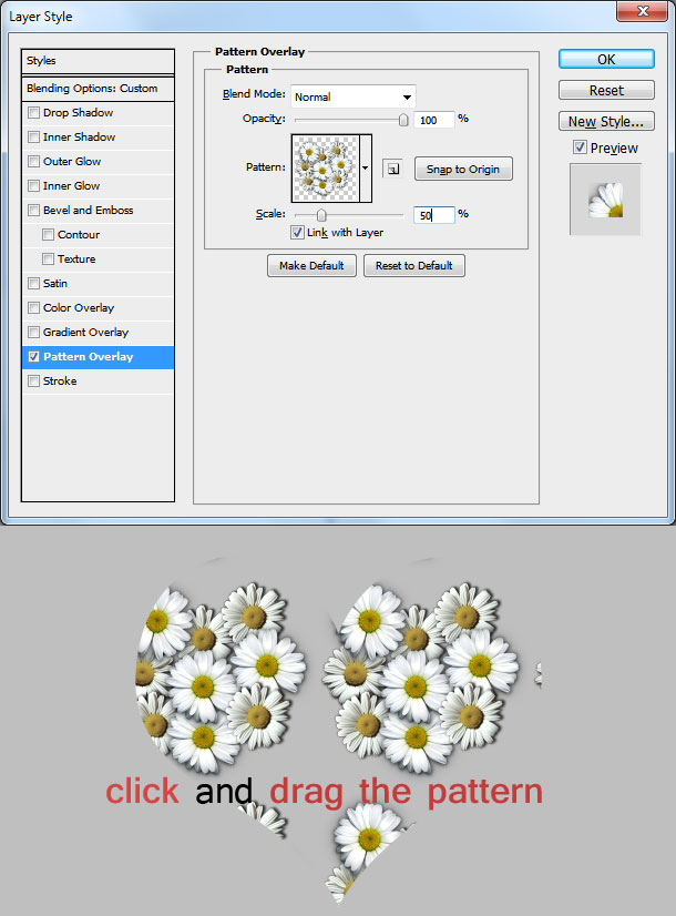Duplicate the Daisy Pattern 1 two times. Open the layer styles of the Daisy Pattern 2 and simply drag the daisy pattern on the heart shape so that you fill the entire area. Do the same with the Daisy Pattern 3