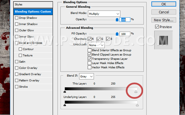 If you want you can add a text on the knife. Use again the blood stains texture and set the blend mode to Darken. Right click on the layer and choose Create Clipping Mask to obtain the bloody stains only on the knife.