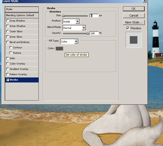 Now with the Clone Stamp Tool fill the shape with the mermaid skin color and texture . Make sure the Sample All Layers box is checked. With the Burn Tool Darken the edges of the tail. Go to the Blending Options of this layer and add Stroke , color # 5b564e.