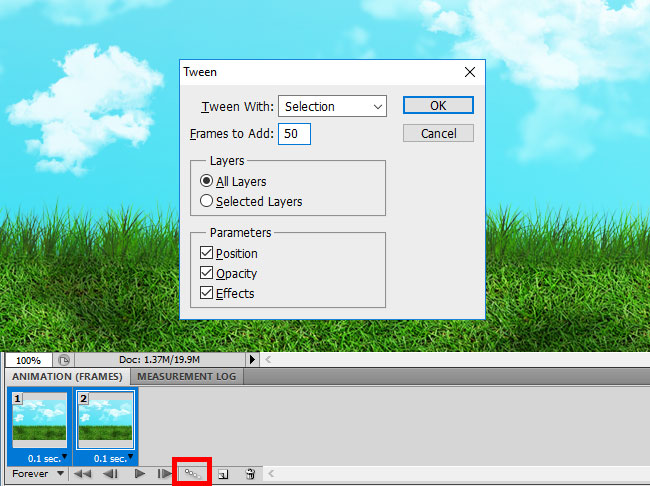 Select the Frame 1 and Frame 2. Click on the Tween Animation Frames button to create the animation. The number of frames determines how fast or slow the clouds are moving.