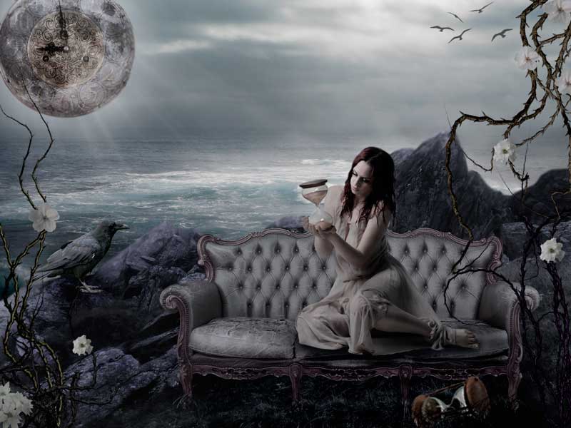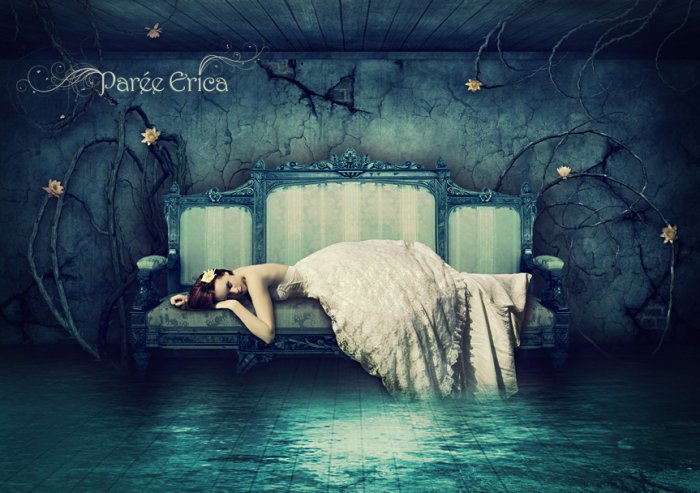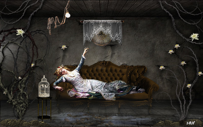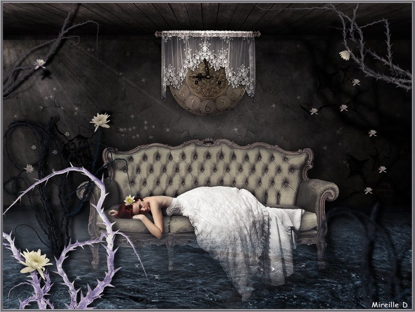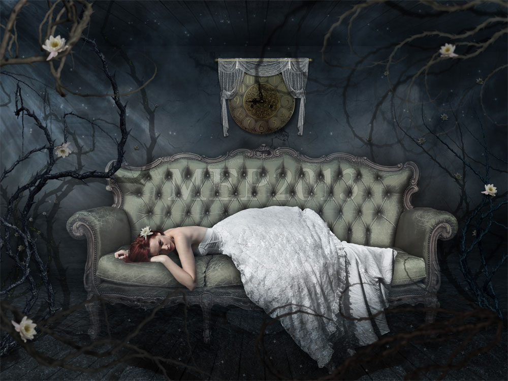 First you have to downloaad all the stock images: dark background, wallpaper, water watch, sofa(I have received the permission to use this photo in my tutorial), girl, lily, lily, lace curtains, rays of light brushes, sparkle brushes, crack brushes, brambles, brambles,
