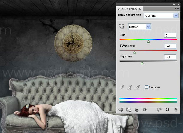 The layer of water place in the group, which is called the "Water". Open the watch drag them to the document and a bit down the (Ctrl + T). Place the watch in the center of the wall above the sofa. Above the layer with the watch add adjustment layer Hue/Saturation with a Clipping Mask.