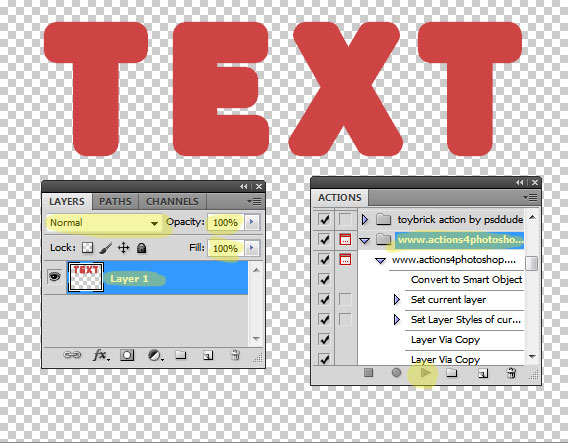 Go to Actions Panel > Load Actions > and choose the actions4photoshop(3D-generator-ver1).atn file reply