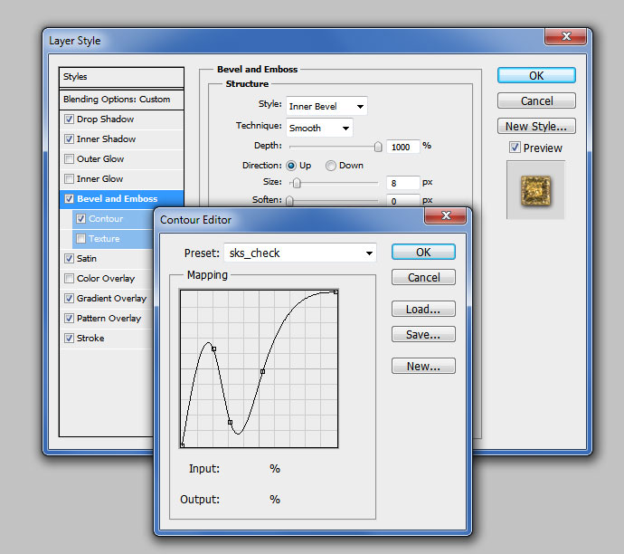 Now I will add a golden glitter style to the Text Outline 1 layer. So open the layer style window and add the following layer styles.