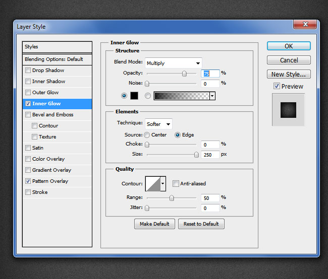 Add an Inner Glow layer style with the following settings. This is one of the ways in wich you can create a vignette effect in Photoshop.