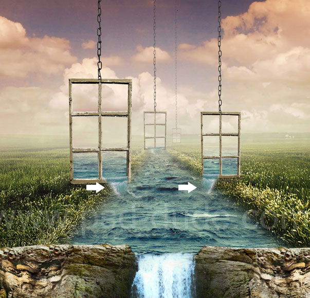 Step 10. Place the water stock image behind the windows like in the image. Simply make 4 selections for each window and cut the areas from the water texture.