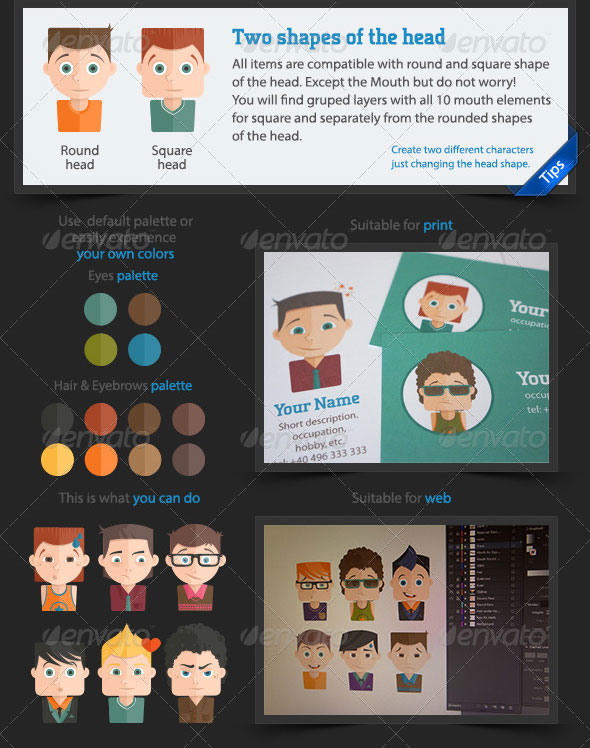 Accurately arranged layers will help you to create a lot of characters. This awesome flat style avatars are suitable for print and web, you can use them to create: Unique characters design, Mascots for your business, Personal logo. Avatars and profile pictures, Illustrations for your websites, Illustrations for flyers, invitation cards, business cards, Greeting cards.