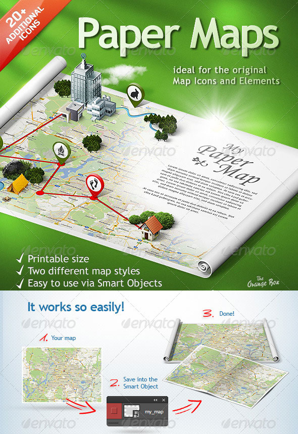 With these Paper Maps you can create impressive maps without any shape or 3D Map Generator. Your maps can be placed into the books very easy via Smart Objects. It takes only a few clicks. For example just take a Google Screenshot of your favored place and paste it into the Smart Object.