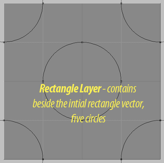 Now move the circle 3 more times so that we cover all the remaining corners. After one move copy the circle in the rectangle layer. Finally, hide the Circle Layer. As a result we have only one visible layer, the Rectangle Layer. Intially the rectangle had only one vector and now if you select it you can see that it has five more circles in the same layer.