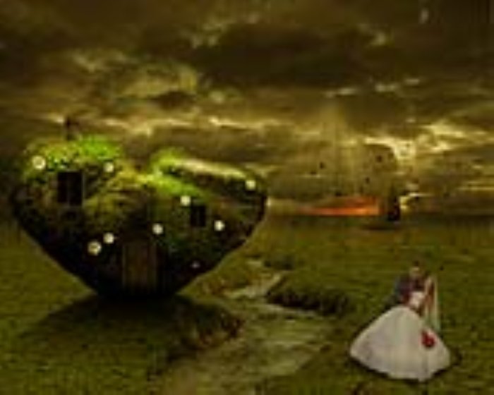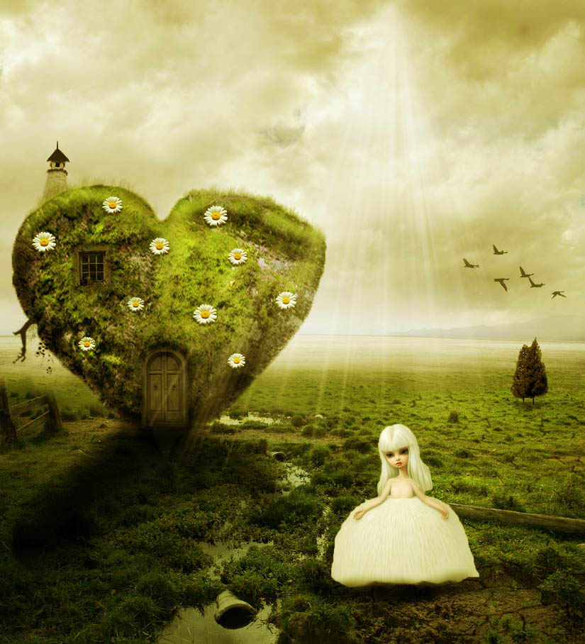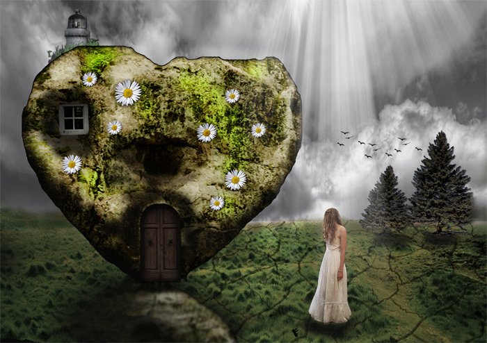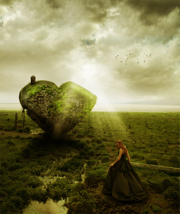 Crop the Door from the Door with Balcony stock image. Resize the door and place it above the Stone Heart. Decrease the Brightness and the Saturation of the Door image. And also increase the Contrast to blend it with the Stone Heart.