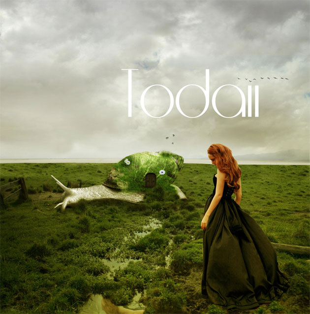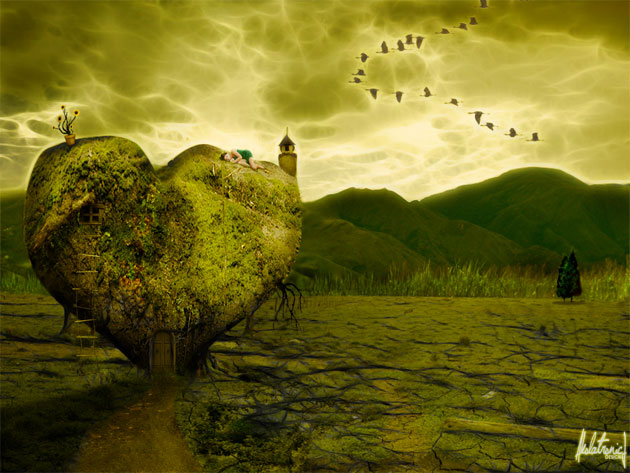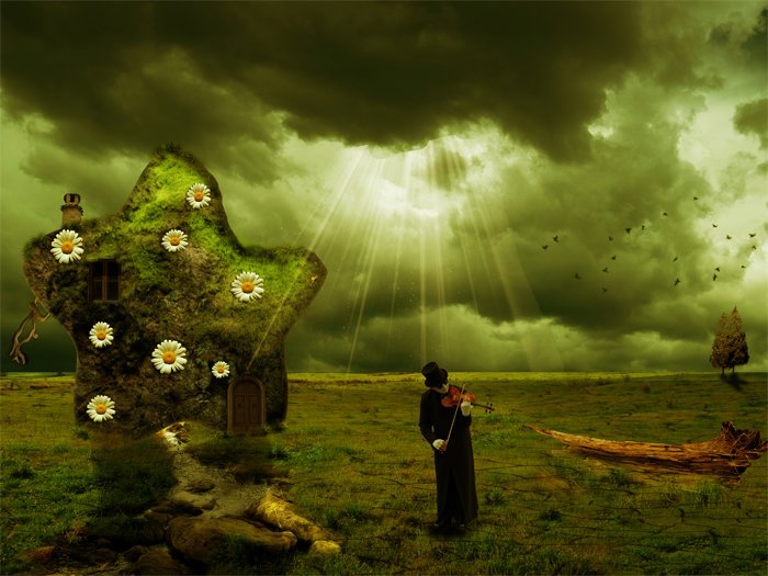 Copy the Landscape with Trees stock image, crop just two trees and place the on the right side of the image. Set the Blend Mode to Darken 100%; that way the trees will blend perfectly with the rest of the image. Use the Dodge Tool to lighten the trees on the top area. Add a soft shadow below using the Brush Tool.