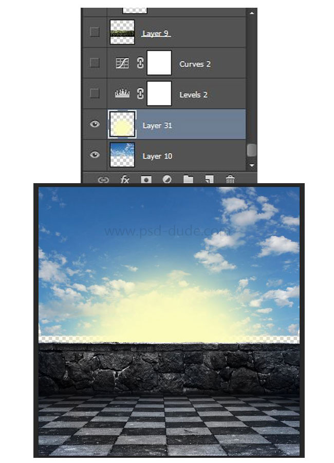 Open field image and use a Quick selection tool to select the sky from this image and delete it. Place the image like shown in the preview.
