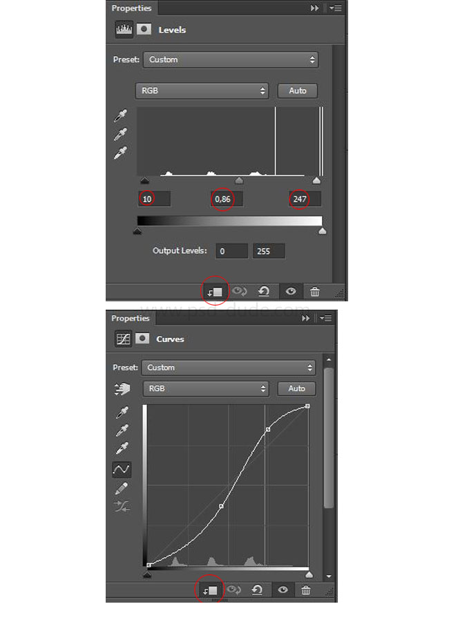 Go to Adjustment layer>Gradient Map and use a black and white colors. Set the blend mode to Soft Light and opaciy to 45%. Go to Adjustment layer>Curves and set blend mode to Soft Light and opacity to 10%. Go to Adjustment layer>Photo Filter, use Warming Filter (85) with Density 44%.